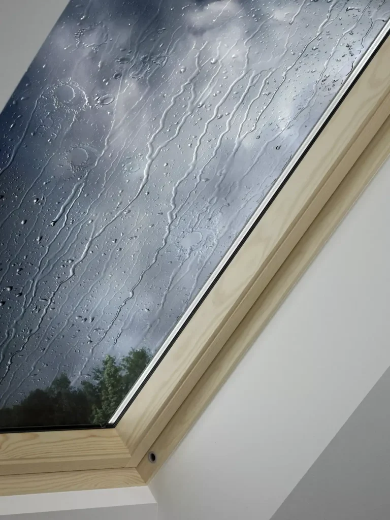 Velux pakt regengeluid niet alleen aan met dikker glas, maar met een combinatie van slimme materialen en doordachte constructie. Elk onderdeel van het raam is ontworpen om trillingen te verminderen en geluidsgolven te breken voordat ze de kamer bereiken. De beglazing, het profiel en zelfs de manier waarop het raam in het dak wordt geplaatst, werken samen om geluid zo veel mogelijk te absorberen.